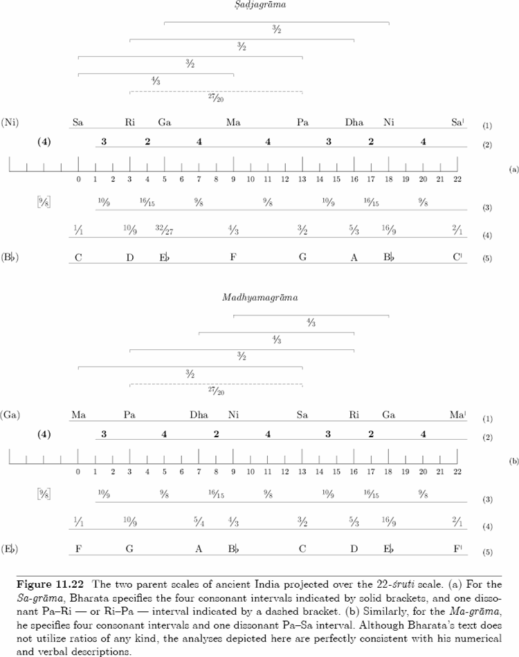 Refer to Figure 11.22(b), and note that it shows the Ma-grama based on the same organizational principles as the Sa-grama in Figure 11.22(a). Again, to verify the authenticity of these ratios, return to the second paragraph of Natyasastra 28.22. Here, Bharata clearly indicates that in the Ma-grama, intervals Sa–Ma or inversion Ma–Sa, Ri–Dha or inversion Dha–Ri, Ga–Ni or inversion Ni–Ga, and Pa–Ri are consonant. The solid brackets in Figure 11.22(b) confirm that these tones span interval ratios 3/2, 4/3, 4/3, and 3/2, respectively. And in same sentence, Bharata observes that the interval Sa–Pa is not consonant. In Figure 11.22(b), the dashed bracket shows that this interval is a dissonant “sharp fourth,” ratio 27/20.